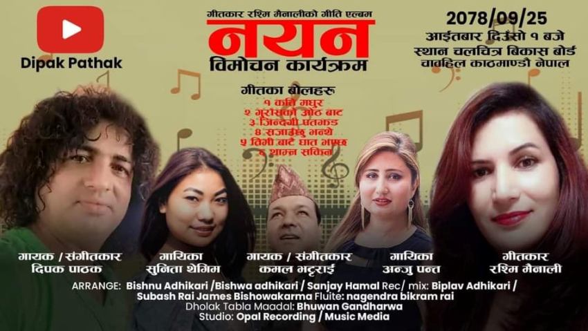 काठमाडौंः गीतकार रश्मि मैनालीको एकल गीती एल्बम ”नयन”को विमोचन गरिएको छ । काठमाडौंको चाबहिलस्थित चलचित्र बिकास बोर्डमा आइतबार चलचित्र निर्देशक तुलसी घिमिरे र बोर्डका अध्यक्ष दयाराम दाहालको प्रमुख अतिथिमा गीतको विमोचन गरिएको हो ।